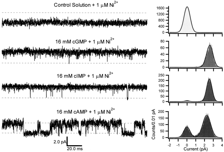 Figure 5. Representative single-channel currents in the presence of Ni2+. Single-channel currents were recorded in the presence of 16 mM cGMP, cIMP, or cAMP, and 1 μM Ni2+. Data are for the same patch as in Fig. 4. Each sweep was 200 ms in duration. The upper and lower dotted lines indicate the open and closed levels, respectively, and are separated by 2.3 pA. The amplitude histograms were normalized to unit area and were fit by the sum of two Gaussians. Parameters for amplitude histograms were as follows: control solution + 1 μM Ni2+: σclosed = 353 fA; 16 mM cGMP + 1 μM Ni2+: σclosed = 2 pA, Pclosed = 0.01, μopen = 2.5 pA, σopen = 374 fA, Popen = 0.99; 16 mM cIMP + 1 μM Ni2+: σclosed = 236 fA, Pclosed = 0.03, μopen = 2.5 pA, σopen = 311 fA, Popen = 0.97; 16 mM cAMP + 1 μM Ni2+: σclosed = 360 fA, Pclosed = 0.28, μopen = 2.3 pA, σopen = 457 fA, Popen = 0.72. |