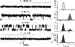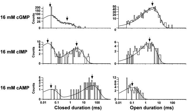 Figure 9. Half-amplitude threshold analysis indicates the presence of two closed and one open states. Closed (left) and open (right) duration histograms for single-channel data recorded with 16 mM cGMP, cIMP, or cAMP. Closed durations were fit to a double and open durations to a single exponential distribution. The time constants are indicated by the arrows. Parameters for the closed duration histograms were as follows: 16 mM cGMP: 1,118 events in histogram, τ(short) = 38 μs (weight, 0.85), τ(long) = 581 μs (weight, 0.15); 16 mM cIMP: 128 events in histogram, τ(short) = 24 μs (weight, 0.69), τ(long) = 4.21 ms (weight, 0.31); 16 mM cAMP: 58 events in histogram, τ(short) = 42 μs (weight, 0.34), τ(long) = 46.4 ms (weight, 0.66). Parameters for the open duration histograms were as follows: 16 mM cGMP: 1,118 events, τ = 3.42 ms; 16 mM cIMP:128 events, τ = 2.04 ms; 16 mM cAMP: 58 events, τ = 102 μs. |