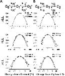 Figure 15. Errors in the determination of the rate constants and single-channel amplitude from HMM analysis. For this analysis, a 0.73-s segment (or 18,198 sample points) from a single-channel patch activated by cGMP was tested to determine the errors in the determination of the rate constants due to the method (see methods). The approach was applied separately for the (A) C0′ ↔ C1′ ↔ O2′ and (B) C ↔ O ↔ C schemes. The abscissa is the percent change in the value of the parameter away from the maximum-likelihood rate. The ordinate is the change in log likelihood from the maximum-likelihood value. The curves were fit by Eq. 1. |