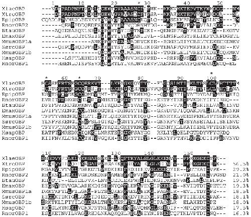 Fig. 2. Xenopus OBP sequences compared to other vertebrate olfactory binding proteins. CLUSTALWalignment of XlaeOBP amino acid sequence with XtroOBP