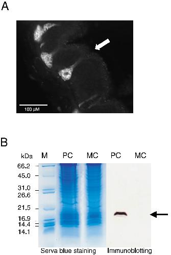 analysis of olfactory mucus selectively sampled from PC and MC of X. laevis. In the left panel, proteins were detected by Serva Blue G250 staining.