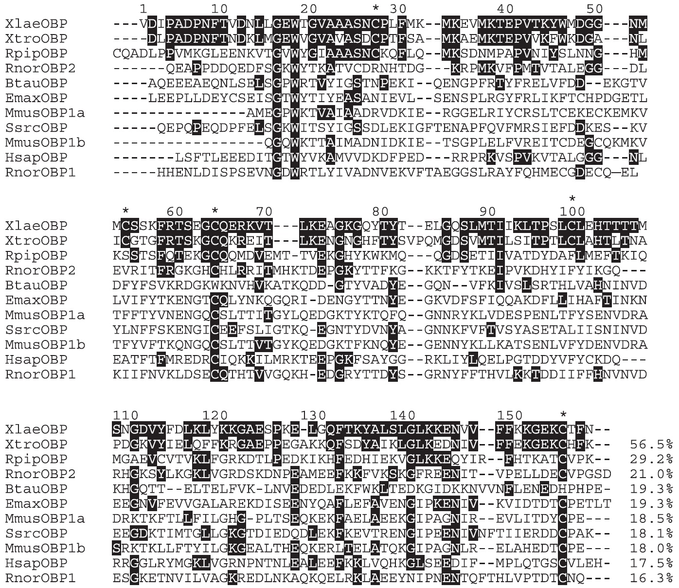 shared with XlaeOBP are shown white on a black background. XlaeOBP cysteins are indicated by an asterisk. OBPs are: XlaeOBP (Xenopus laevis OBP; GenBank