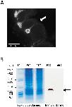 Fig. 4. Expression of XlaeOBP restricted to the principal olfactory cavity. (A) Staining is located at the level of the Bowmanâs gland (open arrow). (B) SDSPAGE