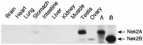 FIG. 4. Organ blot analysis of Nek2A and Nek2B. Total protein