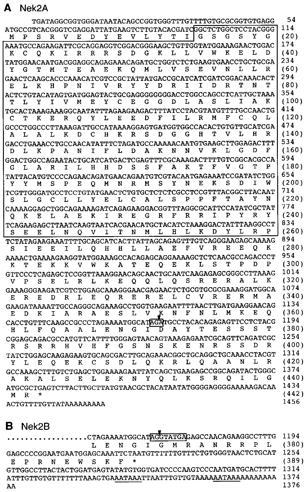FIG. 1. Nucleotide and deduced amino acid sequences of Nek2A (A) and Nek2B (B). In (A), the kinase domain is boxed and the consensus