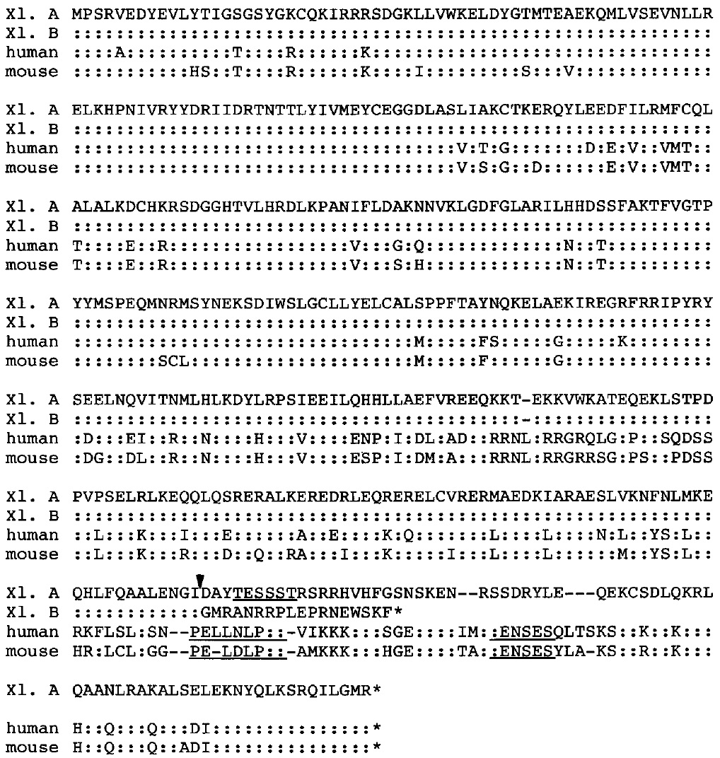 FIG. 2. Comparison of the predicted amino acid sequences of Xenopus Nek2A (X1. A) and Nek2B (X1. B) with those of human (Schultz
