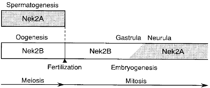 ???displayArticle.abstract??? Nek2 kinase, a NIMA-related kinase, has been suggested to play both meiotic and mitotic roles in mammals, but its function(s) during development is poorly understood. We have isolated here cDNAs encoding a Xenopus homolog of mammalian Nek2 and have shown that Xenopus Nek2 has two structural variants, termed Nek2A and Nek2B. Nek2A, most likely a C-terminally spliced form, corresponds to the previously described human and mouse Nek2, while Nek2B is most probably a novel, C-terminally unspliced form of Nek2. As a consequence of this (probable) alternative splicing, Nek2B lacks the C-terminal 70-amino-acid sequence of Nek2A, which contains a PEST sequence (or a motif for rapid degradation). Western blot analysis reveals that Nek2A is expressed predominantly in the testis (presumably in spermatocytes) and very weakly in the stomach and, during development, only after the neurula stage. By contrast, Nek2B is expressed mainly in the ovary and in both primary and secondary oocytes and early embryos up to the neurula stage. These results suggest that Nek2A and Nek2B may play both meiotic and mitotic roles, but in a spatially and temporally complementary manner during Xenopus development, and that Nek2B, rather than Nek2A (or the conventional form of Nek2), may play an important role in early development. We discuss the possibility that a counterpart of Xenopus Nek2B might also exist and function in early mammalian development.
