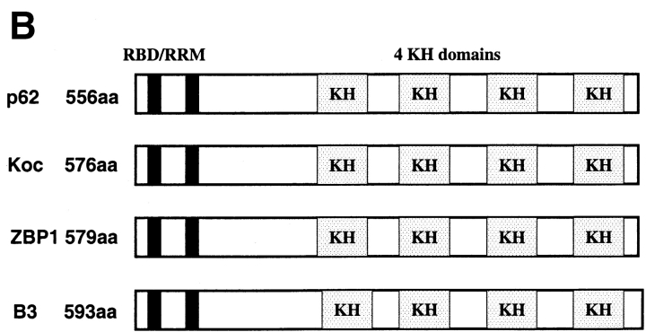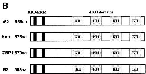 Figure 3. Similarity between p62 and three RNA-binding motif proteins Koc, ZBP1, and B3. (A) The identity between p62 and the other three proteins are shown (*). (B) The great similarity of the domain structures is shown. The RNA-binding domains with two conserved RNP regions, RNP1 and RNP2, and four KH domains are boxed. A nine–amino acid sequence (VGAIIGKE/KG) of unknown function in the first three KH domains is shown in bold as is the REV-like nuclear export signal in the second KH domain.