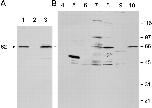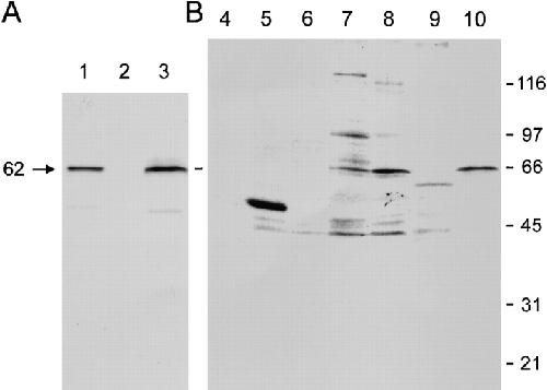 Figure 5. Human anti–62-kD antibody and rabbit anti–recombinant p62 antibodies recognize recombinant antigen. (A) Immunoprecipitation using in vitro–translated products of p62. Lane 1, in vitro–translated products; lane 2, preimmune rabbit serum (No. 3366); lane 3, immune rabbit serum (No. 3366). (B) Immunoprecipitation using [35S]methionine–labeled HeLa cell extracts. Lane 4, normal human serum; lane 5, anti-SSB/La prototype serum, which recognizes an irrelevant 48-kD autoantigen used as a positive control for the assay; lane 6, HCC serum without p62 autoantibodies; lanes 7 and 8, p62 prototype sera; lane 9, preimmune rabbit serum (No. 3366); lane 10, immune rabbit serum (No. 3366).