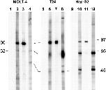Figure 1. Reactivity of three HCC sera in Western blotting against whole cell extracts from MOLT-4, T24, and HepG2 cell lines. Lanes 1, 5, and 9 were normal human sera. Serum YZ (lanes 2, 6, and 10) showed strong reactivity with a 90-kD protein in MOLT-4 cells and reacted weakly with a 62-kD protein in MOLT-4 cells and T24 cell extracts. A strong reaction with the 62-kD protein was detected with HepG2 cell extracts, together with a strong reaction with a 50-kD protein. Sera YL (lanes 3, 7, and 11) and CH (lanes 4, 8, and 12) demonstrate other types of reactions (see text). These representative data demonstrate that HCC sera are heterogeneous in their antibody repertoires and that different cell lines apparently have different expressions of 90-, 62-, and 50-kD proteins.