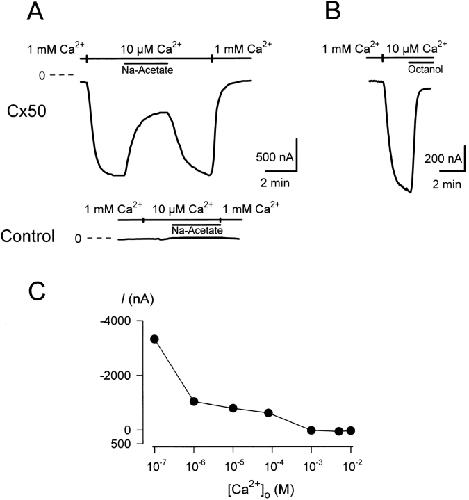 Figure 1. Cx50 hemichannels are sensitive to [Ca2+]o, intracellular pH, and octanol. (A) In a Cx50-expressing oocyte voltage-clamped at −50 mV (top), reduction of [Ca2+]o from 1 mM to 10 μM induced a large inward current (ICx50). Intracellular acidification by the addition of 50 mM Na-acetate to the bathing medium resulted in an ∼65% reversible inhibition of ICx50. In control oocytes (bottom), reduction of [Ca2+]o or intracellular acidification had no appreciable effect on the current. (B) ICx50 was inhibited by addition of 1 mM 1-octanol to the bathing medium. (C) The magnitude of ICx50 depended on [Ca2+]o. Measurements were made 48 h after cRNA injection.