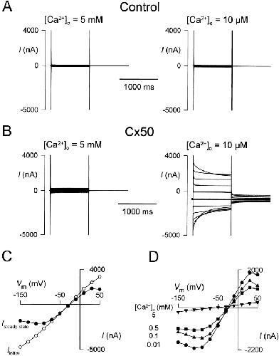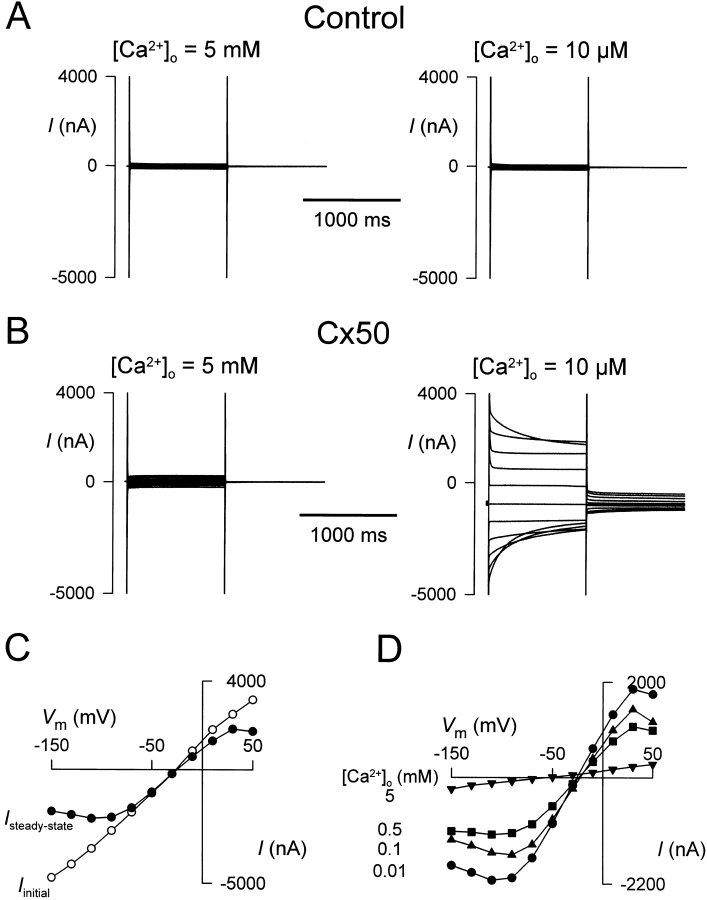 Figure 2. Voltage dependence of Cx50 Ca2+-sensitive currents. (A) In control oocytes, no Ca2+-sensitive currents were observed when [Ca2+]o was lowered (see also Fig. 1 A). The capacitive transient had a single time constant of ∼1 ms. (B) Oocytes expressing Cx50 exhibited large Ca2+-sensitive currents (ICx50) at 10 μM [Ca2+]o. (C) ICx50 at 10 ms (Iinitial) (○) and 980 ms (Isteady-state) (•) after the onset of the voltage pulse. Vrev was the same for both currents (−25 mV). (D) Isteady-state–V at various [Ca2+]o. The data in B–D were obtained from the same oocyte, and those in A and B were obtained from an oocyte from the same batch. Data obtained from over several hundred control and Cx50- expressing oocytes were similar to those reported here.