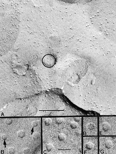 Figure 6. Comparison of the endogenous membrane proteins of the oocyte and the Cx50 hemichannels induced after cRNA injection. (A) A low magnification view of the plasma membrane of an oocyte expressing Cx50 is shown. This region of the plasma membrane was shadowed at a high angle to allow for the analysis of protein size and shape (see Fig. 7). The area enclosed by the large circle is shown in B and the particle in the small circle is shown in D. (B and C) Higher magnification views to show the difference between the smaller endogenous particles (arrows) and the larger Cx50 hemichannels. (D–G) Individual hemichannels were selected from the field in A and shown at high magnification to illustrate their rounded and polygonal overall shape. Scale bars: A, 0.16 μm; B–G, 16.6 nm.