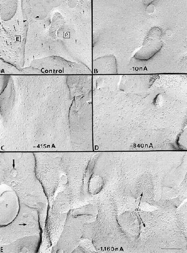 Figure 8. Comparison of the plasma membrane (P face) of a control oocyte with those of oocytes exhibiting different levels of Cx50 expression. (A) The P face (P) of control oocytes contains ∼7-nm diameter particles (small arrows), and the E face (E) is characterized by the presence of 13-nm diameter particles (large arrows). The arrowheads point to the neck connecting a microvillus to the plasma membrane. (B–E) Both ICx50 and the density of hemichannels were measured at various times after the injection of Cx50 cRNA; 6 h (B), 24 h (C), 48 h (D), and 72 h (E) (see also Table II). Expression of Cx50 increases the density of hemichannels only in the P face of the plasma membrane. The density of hemichannels is correlated with the magnitude of ICx50. The first indication of reflective gap junctions (GJ) was found 48 h after cRNA injection (D). Peak values for both ICx50 and the particle density were seen at 72 h (E). In E, the upper left corner shows the convex surface (E) of an annular gap junction and the concave surface of the small vesicles (arrows) containing the characteristic Cx50 hemichannels. Scale bar, 0.2 μm.