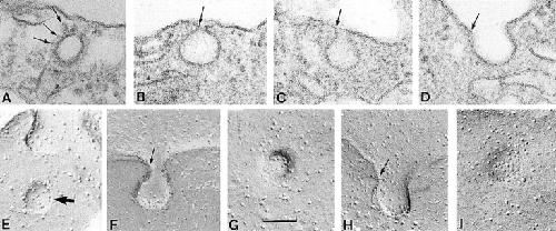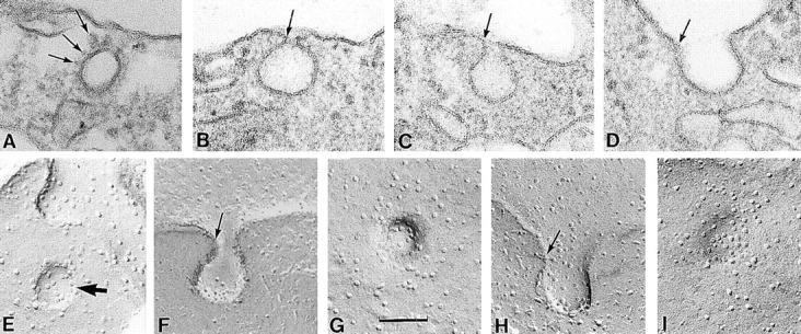 Figure 10. Thin section and freeze-fracture electron microscopy of small vesicles containing Cx50 hemichannels. (A) A small vesicle (∼90 nm in diameter) is shown in the cytoplasm just underneath the plasma membrane. The vesicle is composed of a lipid bilayer from which slender projections (∼15 nm in length) extend into the cytoplasm (small arrows). Similar vesicles were also present in control oocytes but lacked hemichannels. B–D show various stages of the fusion of the small vesicles with the cytoplasm. The vesicles were connected to the plasma membrane through stalks 22–30 nm in length and of variable diameter (B and C, arrows). (D) After fusion, the vesicle remained as a depression in the plasma membrane. (E–I) In freeze fracture, the vesicles contained the characteristic hemichannels (concave face). The vesicles were present in the cytoplasm (E, dark arrow) and fused with the plasma membrane through a stalk 20–25 nm in length (F and H, arrows). Views from the plane of the plasma membrane (G and I) show the complex formed by the fused vesicle (containing the Cx50 hemichannels) and the plasma membrane. Scale bar, 0.1 μm.