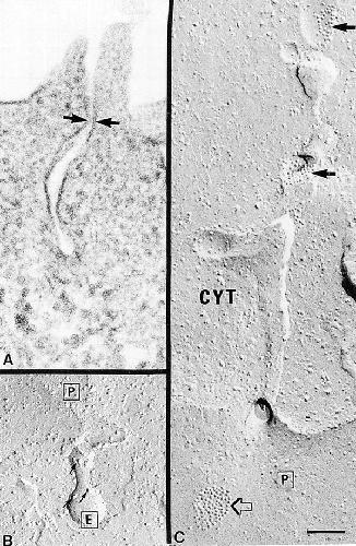 Figure 11. Thin section and freeze-fracture electron microscopy of invaginations of the plasma membrane containing Cx50 hemichannels. (A) Thin section of an infolding (∼0.3 μm in length) of the plasma membrane that ended in a small rounded vesicle. Regions of close membrane apposition often occurred near the plasma membrane (arrows). Similar structures were also observed in control oocytes. (B) Freeze-fracture view of an invagination of the plasma membrane that also ended in a round vesicle of ∼100 nm in diameter. The convex E face (E) of the vesicle exhibited pits complementary to the Cx50 hemichannels, and also contained the endogenous 13-nm diameter particles (small dark arrows). (C) Freeze-fracture view of a long tubular invagination continuous with the plasma membrane. The plasma membrane P face (P) contained single as well as plaques of Cx50 hemichannels (open arrow). Similarly, the invagination contained both single hemichannels and hemichannels in plaques (dark arrows). CYT, cytoplasm. Scale bar, 0.1 μm.