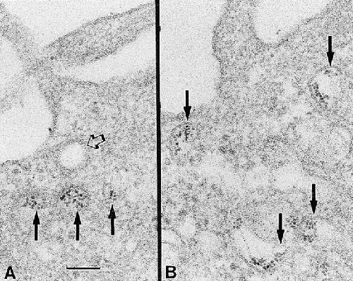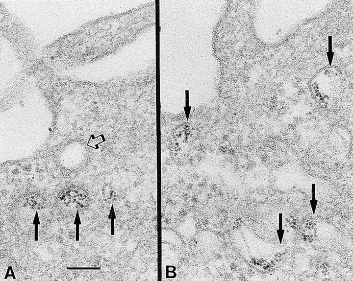 Figure 13. Thin sections of the cortical regions of oocytes incubated in the presence of the enzyme peroxidase. (A) The peroxidase enzymatic products are shown in the lumen (dark arrows) of three vesicles. The open arrow points to a smaller coated vesicle without the marker. B shows several irregularly shaped vesicles (arrows) containing peroxidase reaction products in their lumens. The intraluminal localization of the extracellular marker suggests that these vesicles are derived from the plasma membrane of the oocyte by endocytosis. Scale bar, 0.1 μm.