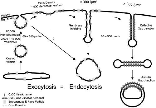 Figure 14. A model proposing that the trafficking of Cx50 hemichannels to and from the plasma membrane of oocytes occurs along the constitutive (default) pathway. We propose that Cx50 is inserted into the plasma membrane as a hemichannel (connexin hexamer). Insertion into the plasma membrane occurs at an initial rate of 80,000 hemichannels/s. Hemichannel insertion is via exocytosis of small coated vesicles at a rate of 2,000–16,000 vesicles/s, corresponding to the addition of 63–503 μm2/s of membrane to the plasma membrane. Retrieval occurs through the formation of membrane invaginations that eventually pinch off and form large vesicles in the cytoplasm. At a hemichannel density <300/μm2, the Cx50 hemichannels are retrieved, intermingled with some endogenous plasma membrane proteins, in the same large vesicles. At a density >300 hemichannels/μm2, the large vesicles form reflective gap junctions that pinch off and appear as annular gap junctions in the cytoplasm. The principal characteristic of this pathway is that the area of the plasma membrane does not change during hemichannel insertion, indicating that plasma membrane endocytosis balances the rate of vesicle insertion.