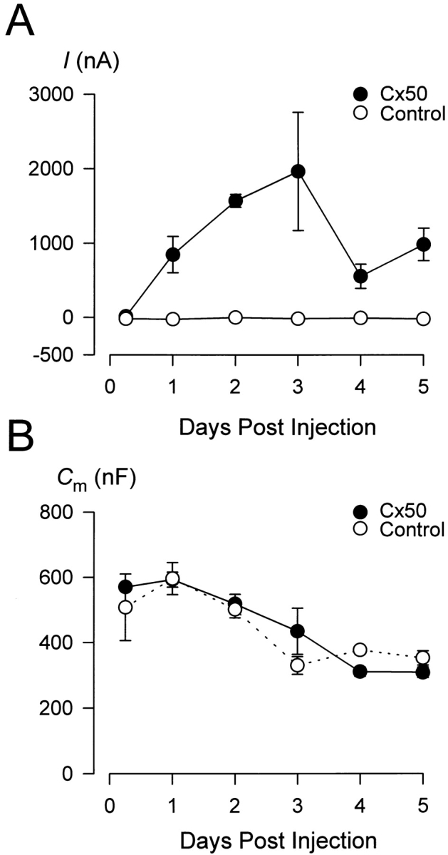 Figure 3. Time course of ICx50 and membrane capacitance (Cm) as a function of Cx50 expression. (A) The magnitude of Ca2+-sensitive currents of control oocytes (○) and ICx50 in oocytes expressing Cx50 (•) 6 h to 5 d after cRNA injection. Vh was −50 mV and the Ca2+-sensitive current was assessed as the difference in the holding current when the [Ca2+]o was changed from 5 mM to 10 μM. (B) Cm of control oocytes (○, dotted line) and oocytes expressing Cx50 (•, solid line) is shown as a function of the time after water or cRNA injection. In both A and B, each data point represents the mean of measurements obtained from three to five different oocytes from the same batch, and the entire protocol was repeated with three different batches of oocytes.