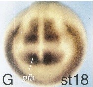 etv1 (ets variant 1) gene expression in Xenopus laevis embryos, NF stage 9, as assayed by in situ hybridization, anterior view, dorsal up. |