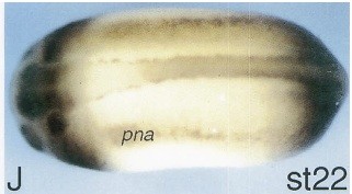 Fig. 3. Whole mount in situ hybridization analysis of XER81 expression during Xenopus embryogenesis. Staged Xenopus embryos were subjected to whole mount in situ hybridization with XER81 antisense RNA. (A) Blastula (stage 9) embryo (top, animal pole; bottom, vegetal pole). (B) Transverse section of the embryo shown in (A). (C) Gastrula (stage 11) embryo (top-animal hemisphere). (D) Transverse section of the embryo shown in (C). (E,H) Anterior view of staged embryos (stages are indicated). (I,J) Dorsal view of a neurula (stage 17) and a stage 22 embryo; abbreviation: pna, pronephros anlage. (K) Parasagital section of a neural tube stage embryo. (L) Analysis of XER81 expression in a tadpole (stage 34) embryo. (M) is a posterior detail from a sagital section, (N) gives anterior details from a dorsal to ventral series of horizontal sections. Abbreviations: aen, archencephalon; aet, archenteron; anp, anterior neural plate; anr, anterior neural ridge; ba, branchial arches; bc, blastocoel; bv, brain ventricle; cbc, circumblastoporal collar; cg, cement gland; cnh, chorda-neural hinge; dbl, dorsal blastopore lip; den, deuteroencephalon; enc, epithelial layer of neuroectoderm; end, endoderm; ev, ear vesicle; eym, endodermal yolk mass; eyv, eye vesicle; fb, forebrain; fge, foregut epithelium; hm, head mesenchyme; le, lens; mhb, midbrain/hindbrain boundary; mz, marginal zone; nc, notochord; ne, neuroectoderm; nec, neuroenteric canal; pfb, prospective forebrain; pna, pronephvic anlage; pnc, posterior notochord; pnd, pronephric duct; pw, posterior wall; scf, spinal cord floor; scr, spinal cord roof; snc, sensorial layer of neuroectoderm; tae, tip of archenteron; vbl, ventral blastopore lip; vym, vegetal yolk mass. |