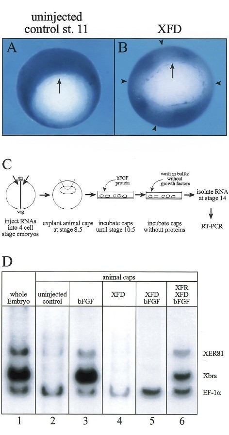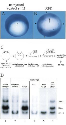 Fig. 6. Expression of XER81 requires FGF signaling. (B) 500 pg of dominant-negative FGF receptor (XFD) mRNA were injected radially in the marginal zone at the 4 cell stage. The embryos were cultured until stage 10.5, fixed in Memfa and hybridized with a digoxigenin-labeled XER81 antisense RNA probe. XFD blocks the expression of XER81 at the sites of injection. (A) Unperturbed XER81 staining in the marginal zone is seen in uninjected control embryos. (C) Experimental design of the animal cap experiment. 200 pg of full length FGF receptor (XFR) or 400 pg of XFD were injected into the four animal blastomeres at the 4 cell stage. Animal caps of injected and not injected embryos were dissected at stage 8.5 and cultured in the presence of bFGF until stage 10.5. The explants were transferred to bFGF-free medium and cultured until stage 14. RNA was isolated and RT-PCR was performed to analyze the expression of XER81, Xbra as a marker and EF-1a as a loading control. 1/17 embryo- or 0.2 animal cap equivalents were used for each PCR reaction. (D) bFGF induces the expression of XER81 and, as expected, of Xbra (lanes 2, 3), but not in the presence of dominant-negative FGF receptor (lanes 4, 5). Addition of the full-length FGF receptor rescues the inducing activity of FGF in the presence of XFD (lane 6).