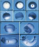 Fig. 3. Spatial expression of XER81 during normal development. Embryos were hybridized with a digoxigenin-labeled XER81 antisense RNA probe. (A) show different gastrula stages in a vegetal view, (Aʹâ²Ê¹â²) in a lateral view. Arrows indicate the dorsal blastopore lip. (D) and (Dʹâ²) show a neurulaembryo in a lateral and anterior view, a: anterior, p: posterior. In (E) and (F) a distinct pattern is visible in the eyes (e), ear vesicles (ev), brain, branchial arches (ba), tailtip and the pronephric duct (pd).