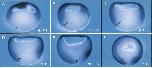 Fig. 4. Spatial expression of XER81 during gastrula stages. Vibratome sections (100 mm thick) were hybridized with a digoxigenin-labeled XER81 antisense RNA probe. With the onset of gastrulation (A) XER81 mRNA is predominantly found in the animal cap. At stage 10 + expression appears in the dorsal marginal zone (B), at stage 10.5 in the ventral marginal zone (C). XER81 expression increases ventrally until it is equally strong in the total marginal zone at stage 11 (D). As gastrulation proceeds, expression of XER81 decreases in the animal cap and increases in the marginal zone (E, F). Arrows denote the dorsal blastopore lip.