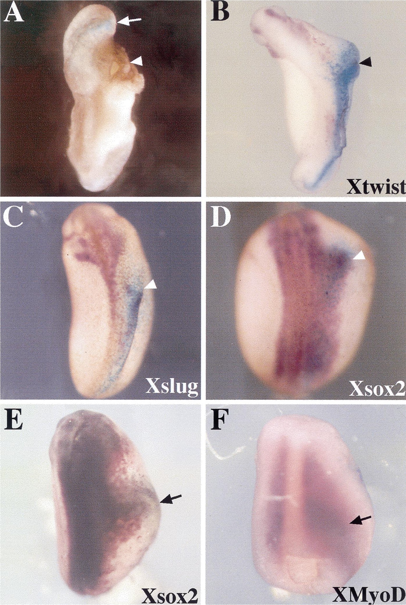 Fig. 3. Effect of Xbf2 overexpression on embryonic development. Embryos were injected at the 1-cell stage (A) or 2-cell stage (B) with different concentrations of Xbf2 mRNA and 0.3 ng of lacZ mRNA as a lineage marker (blue dots). Embryos were cultured until stage 16 or 25, when the expression of different genes was analyzed by in situ hybridization. Views are from the dorsal side, anterior is up. (A) Reduced head and absence of anterior structures, such as eyes or cement gland (arrow) and partial secondary axis (arrowhead) in an embryo injected with 4 ng of Xbf2 mRNA (95%, n = 22). (B) Low level of Xtwist (B) or Xslug (C) expression in the secondary axis of an embryo injected with 0.25 ng of Xbf2 mRNA. This duplicate axis is clearly detected by Xsox2 (D) expression (arrowheads point to the double axis that were found in about 5% of the injected embryos, n = 32, 43 and 54, respectively). (E) Ectopic expression of Xsox2 close to the ventral region of an embryo injected with 4 ng of Xbf2 mRNA (arrow; 93%, n = 54). (F) Embryos injected with 4 ng of Xbf2 mRNA also showed expansion of the XMyoD domain in the injected side (arrow; 75%, n = 40).