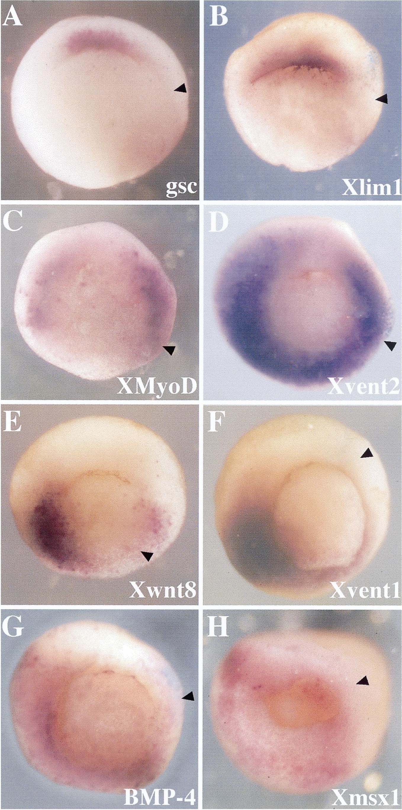 Fig. 5. Effect of Xbf2 mRNA on mesodermal development. Embryos were injected in one cell at the 2-cell stage in the equatorial region with 4 ng of Xbf2 mRNA and 0.3 ng of lacZ mRNA and cultured until stage 10.5-11.5, when the expression of different mesodermal markers were analyzed. Arrowheads point to the injected sites. Neither gsc (A) nor Xlim1 (B) expression were affected by Xfb2 overexpression (100%, n = 18 and 13, respectively). (C) XMyoD expression was strengthened in the lateralmesoderm in the injected side (60%, n = 34). (D) Ventral or lateralXbf2 injections did not affect Xvent2 expression (94%, n = 48). In contrast, overexpression of Xbf2 strongly inhibited the expression ofXwnt8 (E; 95%, n = 45) and Xvent1 (F; 92% n = 23) and weakly that of BMP-4 (G; 80% n = 15) and Xmsx1 (H; 58%, n = 12) at the injection site.