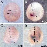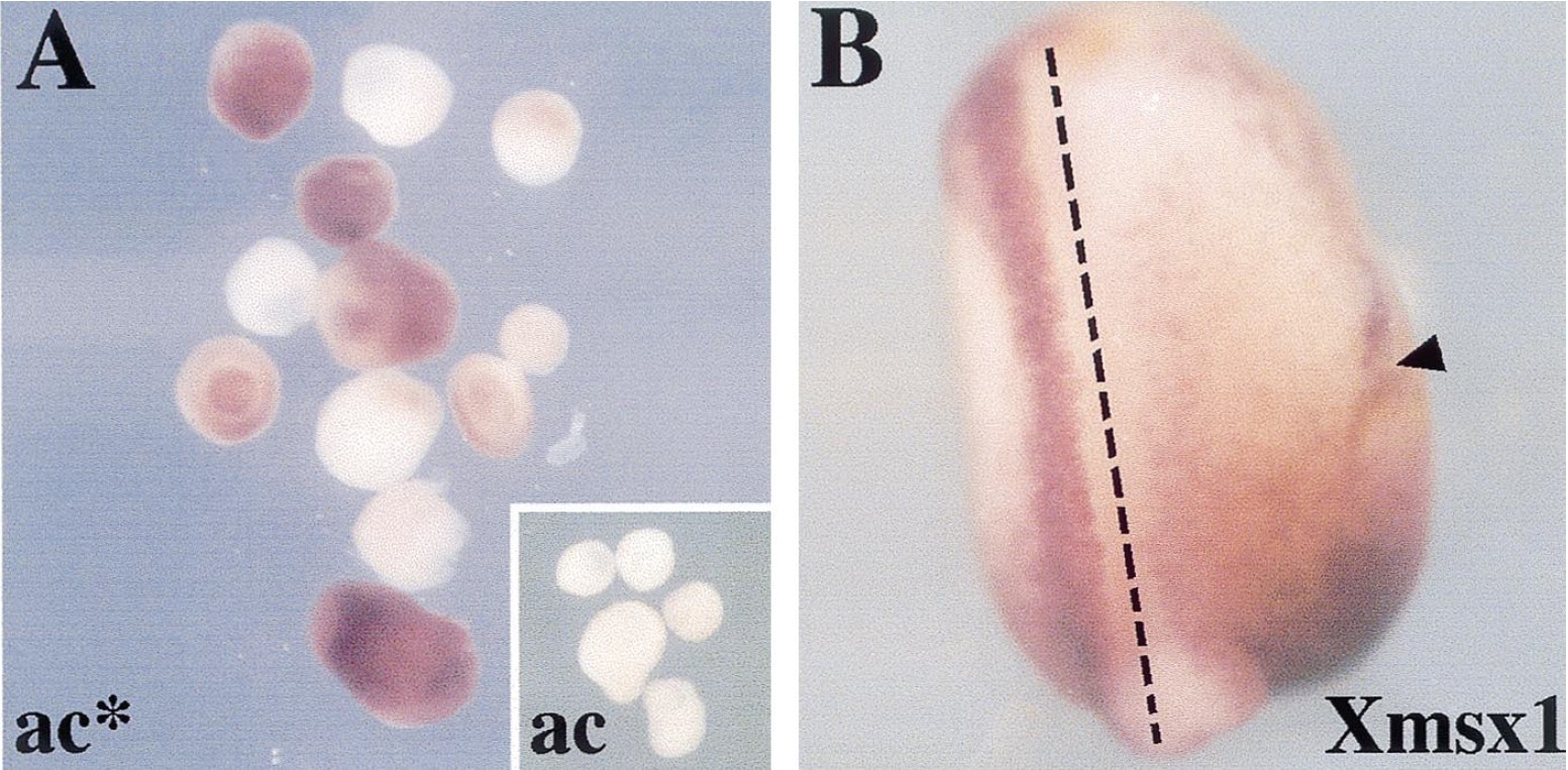 Fig. 6. Direct neuralization of the ectoderm by Xbf2 expression. Animal caps were dissected from stage 9 embryos and cultured until the equivalent of stage 17, when Xsox2 expression was analyzed. (A) Animal caps taken from embryos injected with 4 ng of Xbf2 mRNA at the 1 cell stage. Xsox2 is expressed in these caps (58%, n = 12). Note also that these caps are not elongated as could be expected if dorsal mesoderm was induced. Inset: control animal caps showing no Xsox2 expression (100%, n = 13). (B) Embryos were injected in one blastomere at the 2-cell stage with 4 ng of Xbf2 mRNA and 0.3 ng of lacZ mRNA. Xmsx1 expression was analyzed at stage 16 embryos. Notice the absence of Xmsx1 expression at the injected side (arrowhead; 83%, n = 18).