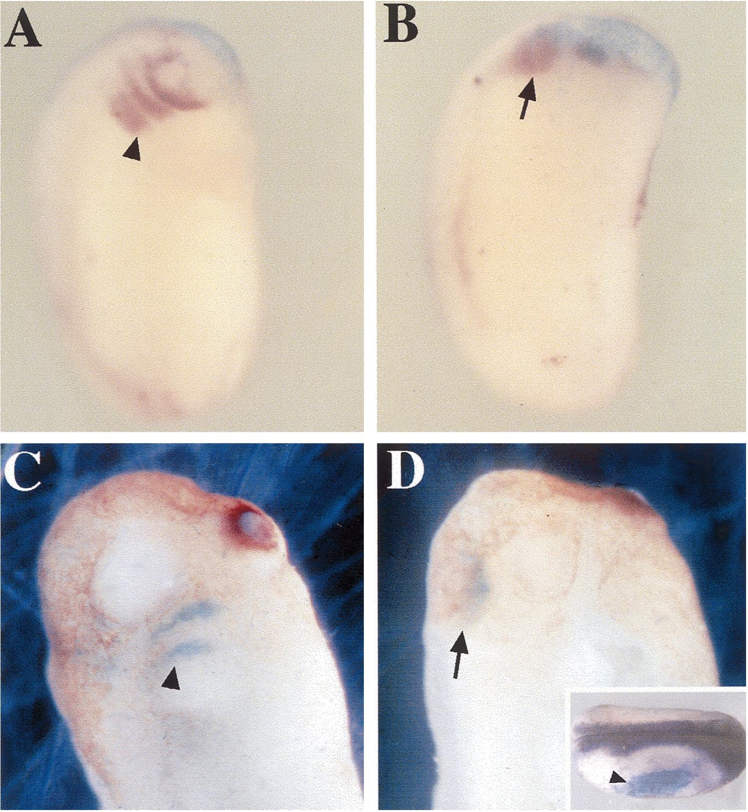 Fig. 8. Overexpression of Xbf2 blocks neural crest migration. (A,B) One blastomere of a 2-cell stage embryo was injected with 0.25 ng of Xbf2 mRNA and 0.3 ng of lacZ mRNA, was cultured until stage 25 and the expression of Xtwist was analyzed. (A) Right side view of the embryo shown in (B). (A) View of uninjected right side. Notice the normal expression of Xtwist and the migration of the neural crest cells (arrowhead). (B) View of injected left side. Notice that the cells still express Xtwist but they do not migrate normally, most of them remaining in the dorsal side of the embryo (arrow; 58%, n = 17). (C,D) Grafts of ectodermal tissue, taken from stage 10 embryos previously injected with 0.3 ng of lacZ mRNA without (C) or with (D) 0.25 ng of Xbf2 mRNA, were placed in the prospective neural crest region of a stage 11 embryo. The embryos were cultured until stage 28 and b-galactosidase was analyzed. (C) Control embryo that received a graft containing lacZ mRNA. Note in C the normal migration of the grafted cells (arrowhead; 87%, n = 15) and in D the permanence of the labeled cells in the original site of the graft (arrow; 87%, n = 15). Inset: a similar, but more lateral (to better distinguish b-galactosidase staining from Xsox2 expression) graft, does not show Xsox2 expression (100%, n = 12).