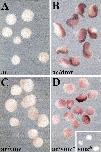 Fig. 4. Xbf2 affects the neural inducer capacity of the mesoderm. Different tissues were dissected from control or Xbf2 injected stage 10 embryos, conjugated and cultured until the equivalent of stage 17, when Xsox2 expression was analyzed. (A) Control animal caps showed no Xsox2 expression (n = 15). (B) All the conjugates of animal cap and dorsal marginal zone strongly expressed Xsox2 (n = 14). (C) Animal caps conjugated with ventral marginal zone did not express Xsox2 (n = 17). (D) Most of the conjugates of animal cap and ventral marginal zone taken from embryos injected with 4 ng of Xbf2 mRNA expressed Xsox2 (70%, n = 13), although at lower levels than conjugates of animal cap and dorsal marginal zone. In contrast, the ventral marginal zone alone taken from injected embryos did not express Xsox2 (inset; n = 10).