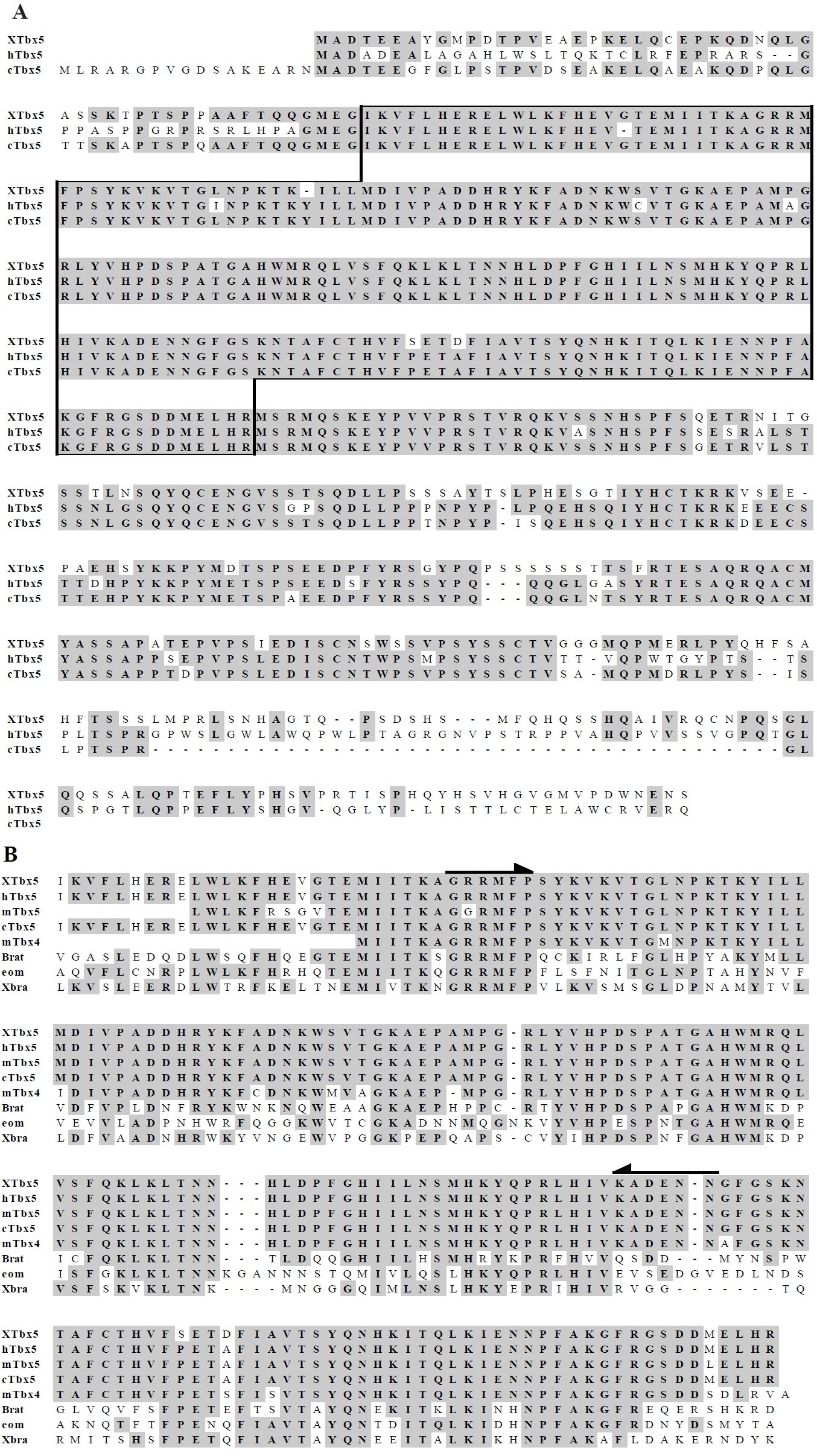 identity is found within the T domain, which is boxed. (B) Amino acid sequence alignment of the T domain of XTbx5 with other T domain