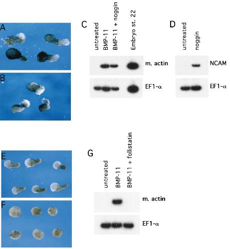 analysis shows that noggin is unable to block BMP-11 induction of muscle actin (m. actin). (D) Recombinant mouse noggin induces the neural