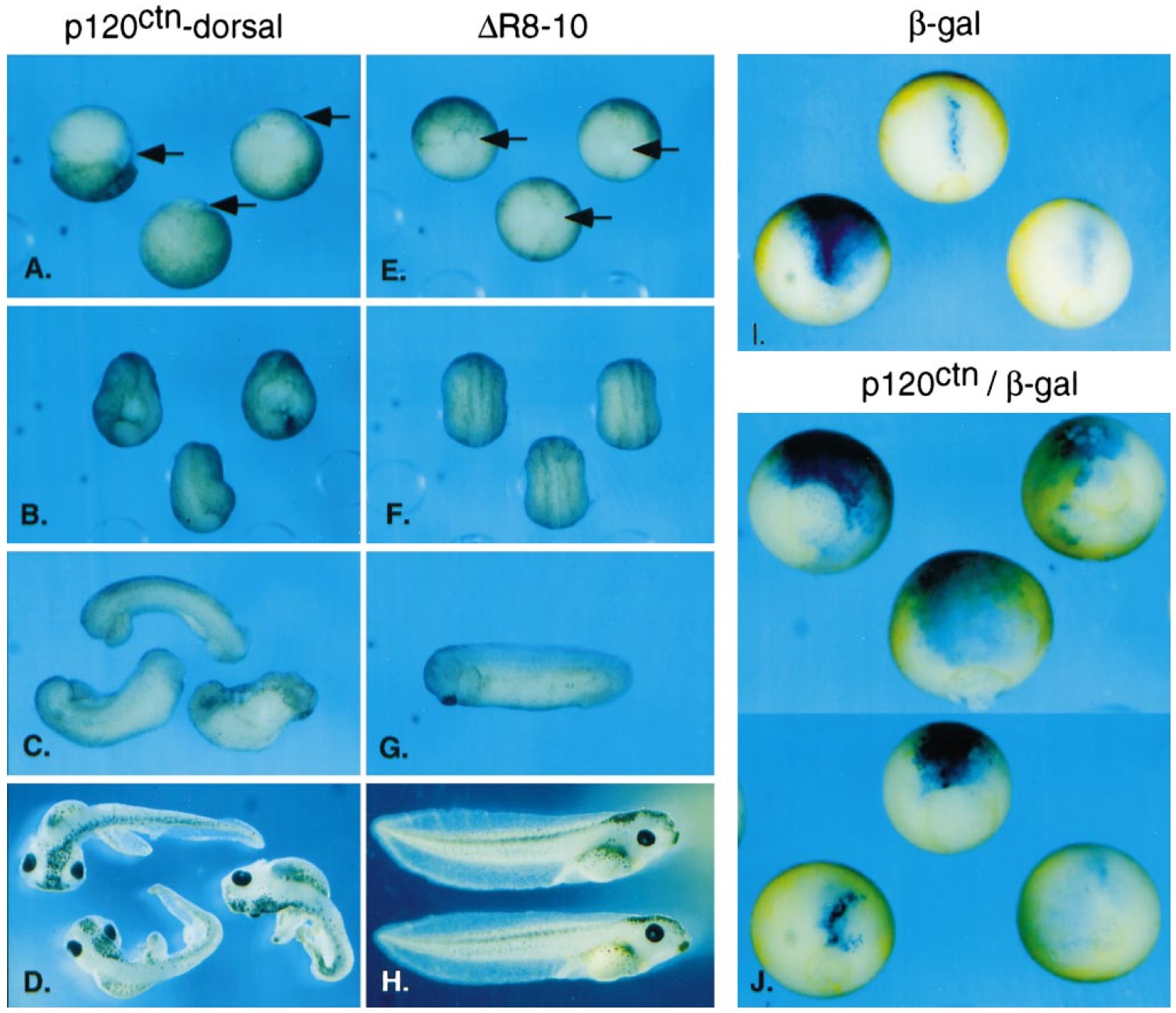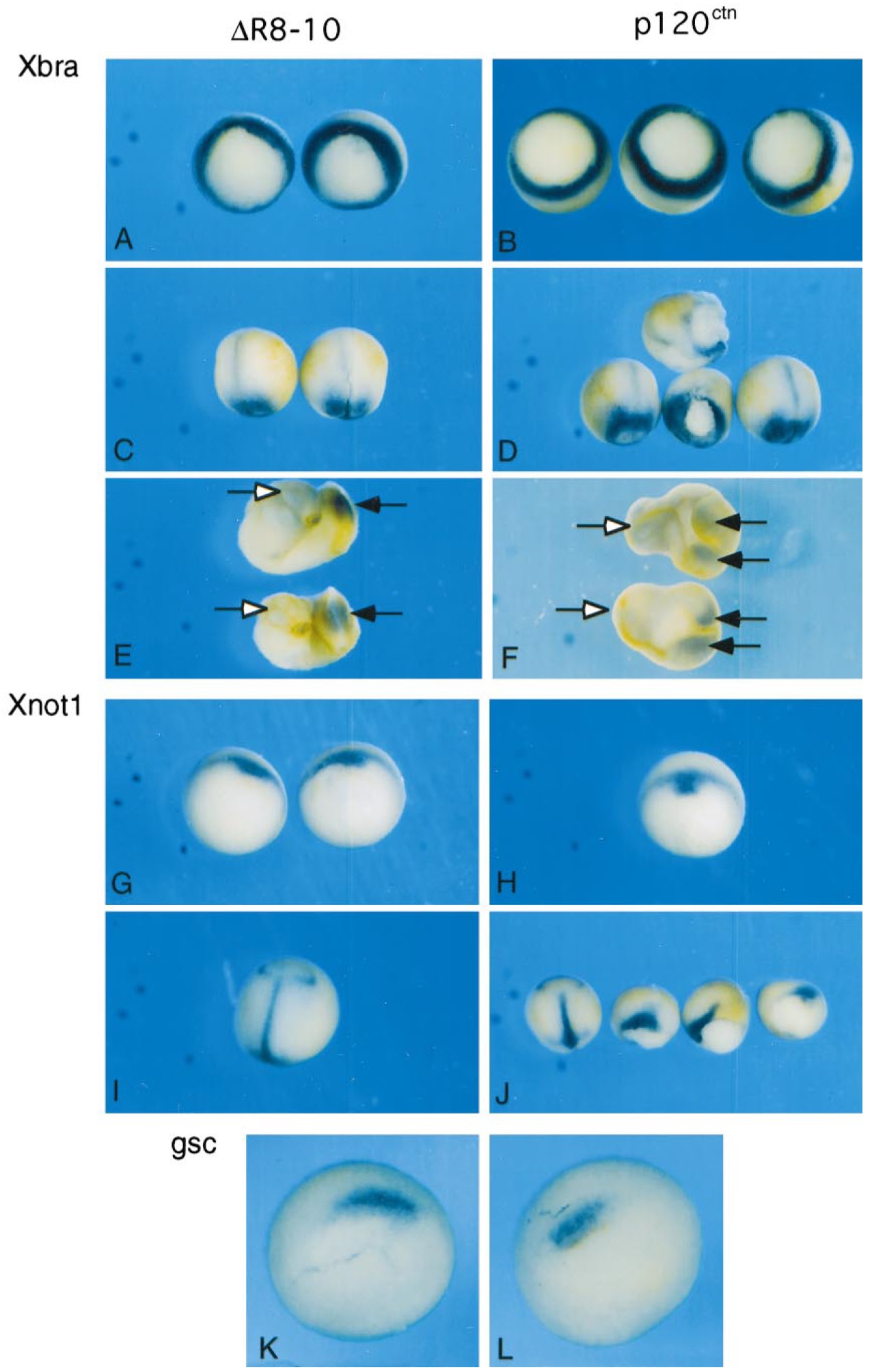 of p120ctn (B, D, F, H, J, L) or DR8-10 (A, C, E, G, I, K) mRNA into one dorsal blastomere at the four-cell stage. Embryos were permitted to