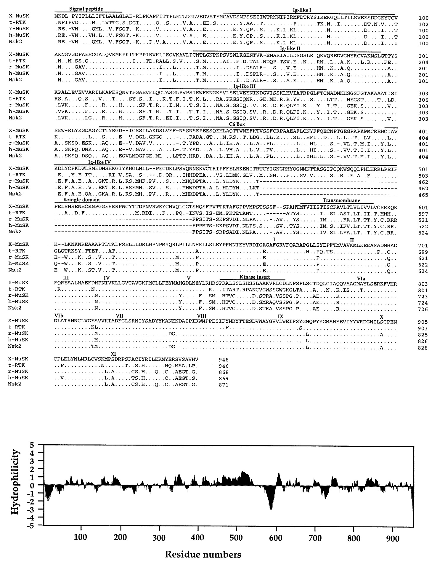 sequence of Xenopus MuSK (x-MuSK) with Torpedo MuSK (t-RTK) and mammalian MuSK (rat, r-MuSK; human, h-MuSK and mouse, Nsk2). Amino acid