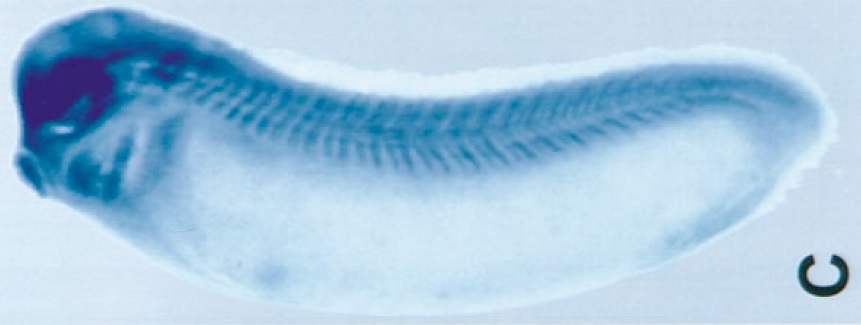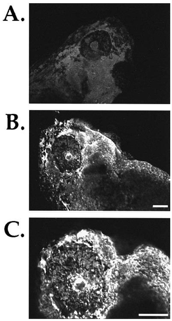 FIG. 7. Immunohistochemical analysis reveals the expression of MuSK protein in the developing eye of stage 35 Xenopus embryos. Whole-mount embryos were stained with anti-MuSK antibody (C-19). (A) Control serum, (B) C-19 followed by secondary antibody, (C) higher magnification of (B). Scale bar, 100 mm.