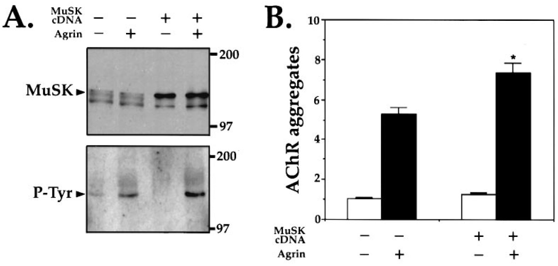 FIG. 8. Functional expression of Xenopus MuSK in chick muscle cells. (A) Western blot analysis of crude cell lysates from mock-transfected chick muscle cells or cells over-expressing Xenopus MuSK using the MuSK-specific antibody (upper panel). Induction of Xenopus MuSK tyrosine phosphorylation by agrin in chick myotubes overexpressing Xenopus MuSK (lower panel). Molecular weight markers are in kDa. (B) Overexpression of Xenopus MuSK enhanced the aggregation of AChRs in primary chick muscle culture. Chick myotubes were mock transfected or transfected with Xenopus MuSK construct, and then treated with active agrin for 12 h. Aggregation of AChRs was assayed by staining with rhodamine-conjugated a-bungarotoxin and counted as described in Materials and methods. Data are presented as the number of AChR aggregates per myotube, mean 6 SEM (n 5 5). The asterisk indicates that the number of agrininduced AChR aggregates differed significantly from mock-transfected cultures (P , 0.05, unpaired t-test).