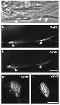 FIG. 5. Localization of MuSK at the NMJ and AChR hot spots. (A) Phase contrast of a neuronmuscle coculture; (B) MuSK labelling with the anti-MuSK antibody; (C) rhodamine-conjugated a-bungarotoxin labelling of AChRs. Arrowheads indicate the neuronâmuscle contacts as well as the AChR aggregates. MuSK was colocalized with AChR aggregates at the NMJ. The nerve process can be seen in phase contrast as indicated by the arrow in (A). (AâC) represent the same view but with different optics. (D) and (E) shows the colocalization of MuSK and AChR hot spots in uninnervated muscle cells. (D) MuSK labelling; (E) rhodamine-conjugated a-bungarotoxin labelling. (D) and (E) represent the same view. Scale bar, 10 mm.