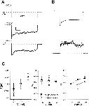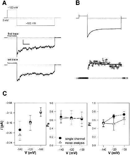 Figure 5. Determination of single channel parameters using macroscopic fluctuation analysis. (A) The voltage protocol (top) was applied repeatedly (at least 100 times). Representative individual registrations are shown below (pHi 6.5; scale bars: 0.1 s and 4 pA). (B) Mean current response for the step to −100 mV (top) and corresponding variance (see methods; scale bar: 0.3 pA2). Thick solid lines represent kinetic fits assuming independent single-exponential gating relaxations for the two gates as described in methods. For clarity, averages of 10 data points are shown as circles for the experimental variance. For the fit, no averaging was performed. (C) Comparison of mean values for the single channel current, i, and the stationary open probabilities, Ps and Pf, obtained by the fluctuation analysis (▵: −140 mV, n = 8; −120 mV, n = 11; −100 mV, n = 9) with the values obtained from the amplitude histograms of single-channel recordings (•: −140 mV, n = 4; −120 mV, n = 7; −100 mV, n = 4).