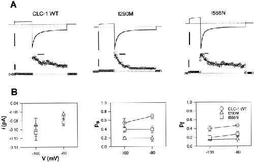Figure 6. Fluctuation analysis for WT ClC-1 and the myotonic mutations I290M and I556N. (A) Representative fluctuation analysis for the three channel types. Mean current (top) and variance (bottom) are shown together with the kinetic fits (thick lines; see Fig. 5). (Registrations are at −100 mV, pHi 7.3; horizontal scale bars, 50 ms; vertical scale bars, 200 pA [top] and 5 pA2 [bottom].) (B) Comparison of single channel parameters obtained for WT ClC-1 and mutants I290M and I556N at pHi 7.3.