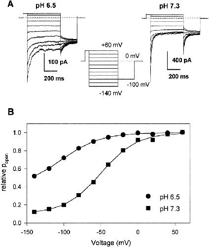 Figure 1. Effect of low intracellular pH on macroscopic gating of ClC-1. (A) Families of voltage-clamp traces measured from different inside-out patches in solutions with the indicated pHi using the stimulation protocol shown in the inset. (B) Plot of the apparent steady state open probability at the end of the third segment of stimulation at different voltages measured as the initial tail current for the constant step to −100 mV normalized to the tail current after the prepulse to +60 mV.