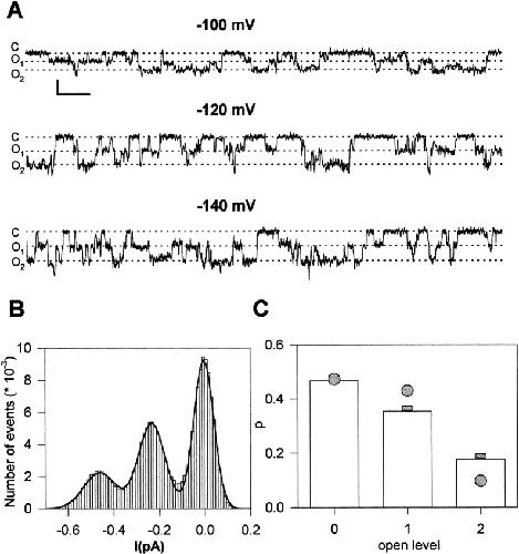 Figure 2. Single ClC-1 channels. (A) Single channel traces at different membrane potentials measured at pHi 6.5. Only short segments of longer registrations are shown. Filtered at 100 Hz for display. For the analysis, data were filtered at 200 Hz (scale bars: 0.2 pA and 0.2 s). (B) Amplitude histogram of a registration at −140 mV and fit with the sum of three equidistant gaussian distributions. (C) Stationary probabilities for the three conductance levels obtained from the gaussian fit (boxes). Circles indicate the best fit assuming two independent channels each with open probability P = 0.31. The “raw” open probability, Praw, obtained by integrating the baseline-subtracted raw current trace [Praw = <I >/(2i)] was Praw = 0.36 for the same data and yielded an even worse fit of the amplitude histogram (not shown). Squares represent the predictions assuming Fig. 3 B for a double-barreled channel with open probabilities Ps = 0.71 and Pf = 0.50, respectively, for the common gate and for the single protopore gate.