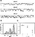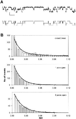 Figure 4. Kinetic analysis of a particularly clean recording. (A) Short segment of the original registration filtered at 200 Hz (top) and the corresponding idealized trace (bottom; scale bars: 0.3 pA and 0.1 s). (B) Dwell time histograms for the three conductance levels (boxes). The dashed line in the top panel is a single exponential fit to the closed-time histogram. Solid lines represent a combined fit of the model shown in Fig. 3 B to the histograms using the maximum-likelihood criterion. Values for the rate constants obtained from the fit are (s−1): α, 34; β, 22; λ, 13; μ, 6. From these, the stationary probabilities Pf = α/(α + β) = 0.59 and Ps = λ/(λ + μ) = 0.68, and the relaxation times τf = 1/ (α + β) = 17 ms and τs = 1/(λ + μ) = 51 ms can be calculated with a ratio τs/τf < 3. The stationary probabilities obtained from the amplitude histogram of the same patch are Pf = 0.48, Ps = 0.74.