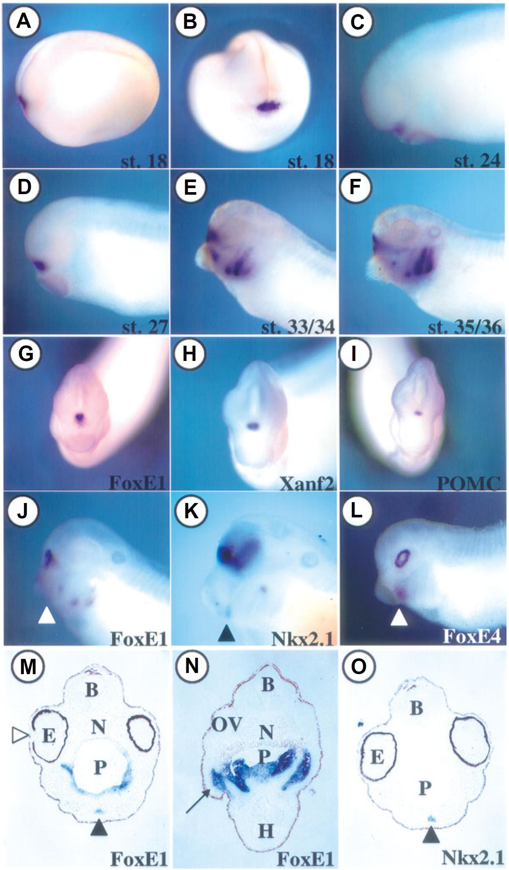 Fig. 2. Expression of FoxE1 in Xenopus embryos. (A-F) Lateral (A,C-F) and anterior (B) views of whole mount in situ hybridized with antisense probe for FoxE1. (A,B) Stage 18, (C) Stage 24, (D) Stage 27, (E) Stage 33/34 and (F) Stage 35/36. (GL) Comparison of FoxE1 expression with markers of the pituitary (H,I) and thyroid development (K,L). (G) Anterior view of a st 35/36 embryo hybridized with FoxE1. (H,I) Anterior views of tailbud stage embryos hybridized with antisense riboprobes for Xanf2 and POMC, respectively. (J,K,L) Lateral view of tailbud stage embryos hybridized with antisense riboprobes for FoxE1, Nkx2.1 and FoxE4 (Xlens1), respectively. Arrowheads denote the position of thyroid expression. (M-O) Section in situ hybridization of st 38 embryos hybridized with antisense probes for FoxE1 (M, O) or Nkx2.1 (N). (M) Expression of FoxE1 in the thyroid (arrowhead) and pharyngeal endoderm. No expression is observed in the lens (open arrowhead). (N) Expression of FoxE1 in branchial arch mesoderm (arrow) and pharyngeal endoderm. (O) Expression of Nkx2.1 in the thyroid (arrowhead). B, brain; E, eye; H, heart; N, notochord; OV, otic vesicle; P, pharynx.