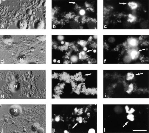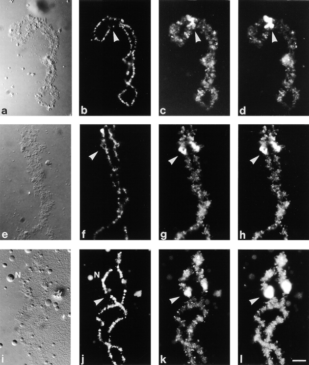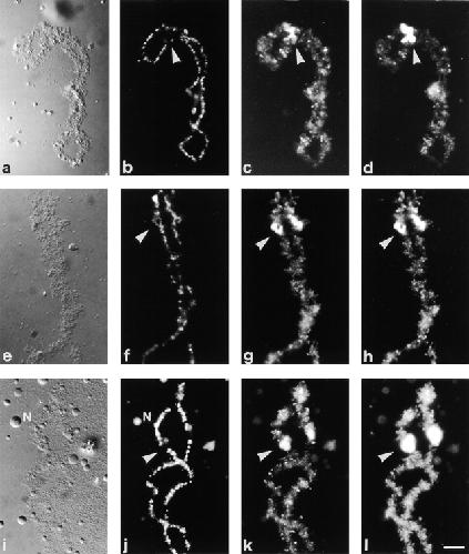 Figure 4. Double staining of the special loop on bivalent no. 3 with various antibodies and SAT antiserum. (a, d, g, and j) DIC images, (b, e, h, and k) fluorescein channel, and (c, f, i, and l) staining with SAT4 antiserum in the rhodamine channel. Arrows mark the position of the special loop. (aâc) Staining with mAbH14 (b) shows the presence of RNA Pol-II on all regular loops as a fine signal seen in the center of each loop. However, Pol-II is absent from the special loop which is brilliantly labeled by SAT4 antiserum (c). (dâf) Staining with mAb K121 indicates the presence of 3mG snRNP cap structures on the special loop (e) which is also labeled with SAT4 antiserum (f). (gâi) mAb Y12 stains regular loops and the special loop indicating the presence of Sm proteins on the special loop (h). (jâl) The SR splicing factor SC35 can also be found on the special loop (k). Bar, 10 μm.