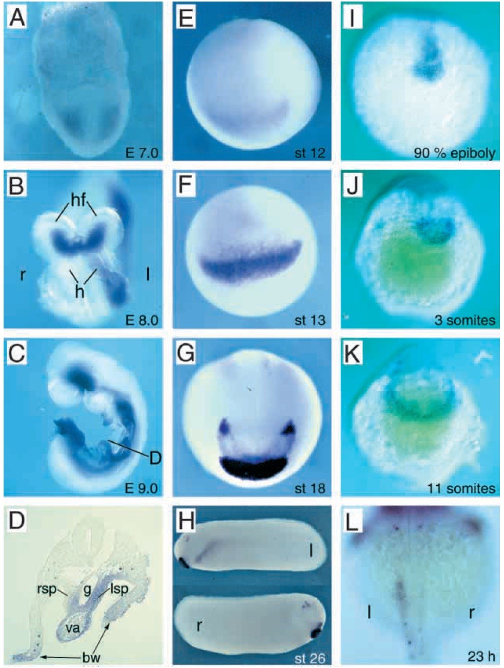 somites). hf, headfolds; h, heart; l, left; r, right.
