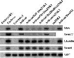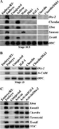 Fig. 1. Induction of Otx2 expression in ectodermal explants by IGF-I. (A) IGF pathway specifically activates Otx2 transcription. Synthetic mRNAs corresponding to Wnt-1, Dkk-1, chordin and IGF-I were injected near the animal pole region at 2-cell stage. Ectodermal explants from uninjected and injected embryos were dissected at blastula stage, explants from uninjected embryos were also treated with activin. RT-PCR was performed at early gastrula stage. Strong Otx2 expression was detected in explants expressing IGF-I, while activin, Wnt-1, chordin and Dkk-1 or a combination of chordin and Dkk1 had no effect on Otx2 expression. (B) Explants expressing indicated mRNA cultured to stage 25 express neural markers like Otx2 and N-CAM. (C) Specific inhibition of Xbra and Xwnt11 expression by IGF-I and Otx2 in activin-treated explants. IGF-I and Otx2 had no effect on the expression of chordin, goosecoid and Xwnt8 induced by activin
