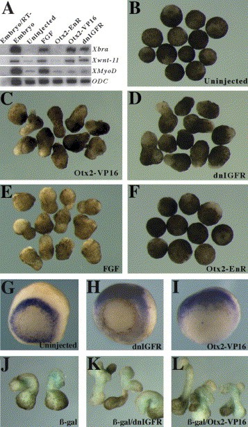 Fig. 4. Induction of Xbra and Xwnt11 expression and convergent extension through inhibition of IGF signaling and Otx2 activity. (AâF) Otx2-EnR, Otx2-VP16 or dnIGFR mRNA was injected in the animal pole region at 4-cell stage. Ectodermal explants were dissected at blastula stage and cultured to early gastrula for RT-PCR analysis (A) or to late neurula stage for analysis of explant elongation (BâF). (A) RT-PCR analysis showing that Otx2-VP16 and dnIGFR induce Xbra and Xwnt11 expression in ectodermal explants similarly as bFGF. At late neurula stage, uninjected (B) or Otx2-EnR-injected (F) explants remain rounded, while Otx2-VP16-injected (C) and dnIGFR-injected (D) explants exhibit elongation similarly as bFGF-treated explants (E). (GâL) Embryos at 8-cell stage were injected with dnIGFR or Otx2-VP16 mRNA in the two dorso-animal blastomeres either alone or coinjected with Lac Z mRNA. Injected embryos at early gastrula stage were either prepared for in situ hybridization (GâI) or for âKeller sandwich explantsâ (JâL). (GâI) Dorsal injection of dnIGFR (H) or Otx2-VP16 (I) mRNA expands the expression of Xwnt11. (JâL) Both dnIGFR (K) and Otx2-VP16 (L) potentiate elongation in âKeller sandwich explantsâ.